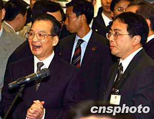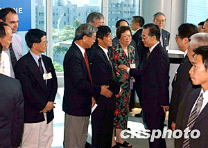六月三十日,國(guó)務(wù)院總理溫家寶參觀香港大學(xué)醫(yī)學(xué)院,并與教授們談笑。中新社記者 潘索菲 攝