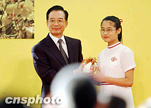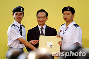 國務(wù)院總理溫家寶6月30日香港表揚醫(yī)護人員成功克服SARS聚會上,接受香港學(xué)生贈送紀(jì)念品。洪少葵 攝