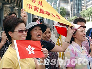香港特區(qū)政府為慶;貧w祖國(guó)六周年,7月1日早上在灣仔金紫荊廣場(chǎng)舉行升旗禮,圖為參與觀禮的市民十分興奮。中新社記者 錢興強(qiáng) 攝