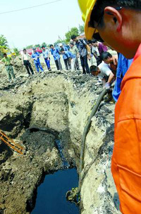 12時許,經過緊張挖掘,維修人員在地面以下3米的“穿路套管”處,發(fā)現(xiàn)泄漏出來的原油,記者看到這里油如泉涌。據(jù)現(xiàn)場的技術人員介紹,從現(xiàn)場情況看來,泄漏情況比較嚴重,必須把這段長約24米的“穿路套管”打開后才能進行維修。