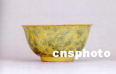 圖為明嘉靖黃地綠彩福祿壽紋碗,將松竹梅與福祿壽和云芝石融為一體,未見海內(nèi)外公私收藏著錄,估價四十五萬元人民幣。中新社圖