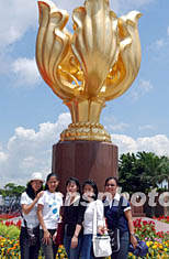 隨著內地、香港SARS疫癥的平息,來香港旅游的觀光客明顯增多,圖為游客在金紫荊廣場留影拍照。中新社記者 錢興強 攝