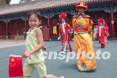 身穿清代服裝的游客七月四日在北京故宮午門前準(zhǔn)備拍照。隨著北京故宮旅游的逐漸復(fù)蘇,受非典影響停業(yè)兩個(gè)多月的古裝攝影也開始恢復(fù)營業(yè)。中新社記者 張煒 攝