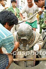 四日,上海軌道交通4號線事故搶險工作正加緊進(jìn)行,一位身穿潛水服的搶險人員正準(zhǔn)備從窨井深入水下進(jìn)行作業(yè)。作者:湯彥俊