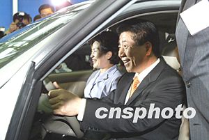 韓國(guó)現(xiàn)代集團(tuán)會(huì)長(zhǎng)鄭夢(mèng)九向盧武鉉介紹新車(chē)性能。中新社記者:毛建軍  盧武鉉與夫人興致勃勃地一起試乘下線新車(chē)。中新社記者:毛建軍