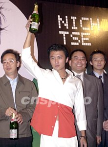 歌星謝霆鋒7月10日在香港出席其唱片《Re born》祝捷會(huì),《Re born》推出壹個(gè)月在中、港、臺(tái)、星、馬各地獲歌迷熱烈支持,共賣出三十萬張獲得六白金唱片榮譽(yù)。謝霆鋒在祝捷會(huì)上高舉香檳慶祝。作者:鄧慶樂