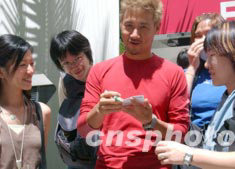 香港歌星張學(xué)友,七月十二日接受香港新城電臺(tái)“家天下”節(jié)目專(zhuān)訪(fǎng),等候的歌迷爭(zhēng)相請(qǐng)張學(xué)友簽字。中新社傳真 錢(qián)興強(qiáng) 攝