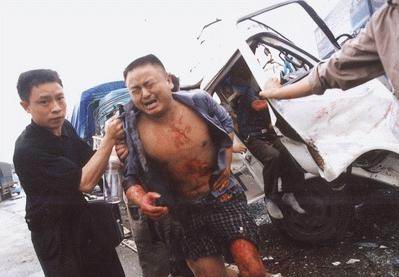 在現(xiàn)場,聚集在受損最為嚴(yán)重的川M05049小貨車周圍的司機(jī)此刻也動(dòng)手救助卡在駕駛室里的同行。要救人就必須移開小貨車前面那輛大貨車,但它已經(jīng)無法發(fā)動(dòng),“我來試試!”排在第一的東風(fēng)大貨車司機(jī)從破裂的車窗翻進(jìn)駕駛室,汽車被發(fā)動(dòng)了!車輪在一厘米一厘米地前移,因猛烈撞擊已經(jīng)交錯(cuò)纏繞在一起的車體鋼板發(fā)出分離時(shí)的撕裂聲,川M05049已成麻花的駕駛室漸漸被移動(dòng)的前車扯高,當(dāng)最后一塊鋼板脫離時(shí),駕駛室轟然落下,被卡的3名傷者同時(shí)高聲喊疼。7時(shí)42分大家奮力拉開變形車門,將馬偉和劉德志抱出了險(xiǎn)境。重傷者記者鼓勵(lì)堅(jiān)持下去