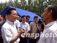 10時50分,總理又來到前進村災(zāi)民點。在68歲的村民李兆業(yè)家,王金山省長說:“老人家,總理來看你了。”李兆業(yè)一邊說:“謝謝總理關(guān)心”,一邊搬凳子請總理坐。細心的總理看老人腿不好,讓李兆業(yè)先找凳子坐下,自己才落座,并開始詢問情況。“搬這兒來,缺不缺吃的、用的?”總理問!安蝗,政府都給了。”老人答!岸冀o了些什么呀?”“發(fā)了米、面粉、方便面、油、煤、蚊香,還有其他東西!薄吧眢w還好嗎?有沒有毛?”“身體還好,就是有點老毛病!薄熬湍銈兝蟽煽趩?孩子來看你沒有?”“兒子到杭州打工去了!薄皟鹤又滥銈冞@兒鬧水災(zāi)了嗎?可打電話來,給二老寄錢沒有?”“兒子知道遭災(zāi)了,打電話回來了,還沒到寄錢的時候……”總理仔細地問,老人一一回答,仿佛是親朋好友在拉家常?偫砼R走時握著李兆業(yè)的手說:“我來看看你,代表黨中央、國務(wù)院,代表胡錦濤總書記和軍委江澤民主席來看你。知道你們生活安排得好,我就放心了!崩钫讟I(yè)激動地說:“感謝黨和政府,感謝總理的關(guān)心!