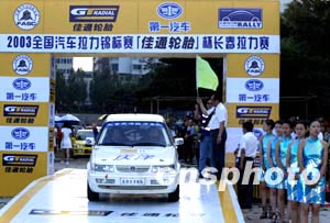 因受“非典”影響而推遲的中國汽車?yán)惖诙颈荣?5日晚移師吉林省長春市,來自全國的56輛賽車參加本次比賽,吉林省省長洪虎為北京慶洋車隊著名車手任志國揮旗發(fā)車。中新社記者:趙振清