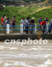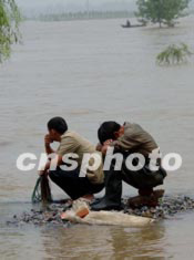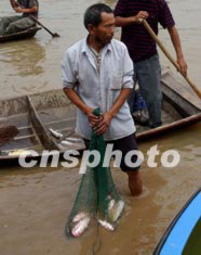 今夏淮河洪水淹沒千里漁米之鄉(xiāng)的魚塘,養(yǎng)魚農(nóng)民血本無歸。安徽省阜陽縣王家壩的漁民和村民目前抓緊撒網(wǎng)捕撈流失之魚,略補生活損失。中新社記者:賈國榮