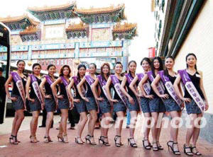 二○○三年紐約華裔小姐選美會決賽入圍佳麗日前到首都華盛頓探訪當?shù)貎S團,并參觀國會山莊。圖為眾佳麗在華盛頓中國城牌坊前合影。作者:龔高