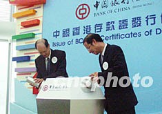 中國銀行(香港)21日在香港宣布推出四組港元及美元存款證,其中票面年息率最高為百分之三點四五。圖為該行副總裁林炎南(左)主持發(fā)行儀式。作者:裘之越