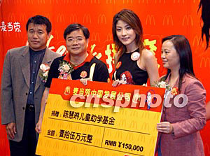 麥當(dāng)勞“搖滾薯?xiàng)l”形象代言人陳慧琳七月二十二日下午現(xiàn)身廣州,在海珠廣場(chǎng)麥當(dāng)勞分店參加了一系列的推廣活動(dòng)。當(dāng)天廣東三元麥當(dāng)勞公司向陳慧琳兒童基金捐款十五萬元人民幣。作者:梁永強(qiáng)