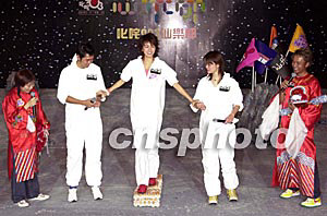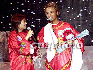 眾歌星7月22日在香港九龍灣展貿(mào)中心出席商業(yè)電臺《03之夏903給你一個星級會所·仙樂都》記者會,歌星李克勤一身古裝新郎裝飾,打扮搶鏡介紹活動詳情。作者:鄧慶樂