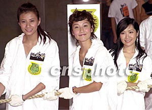 歌星黃伊汶、陳文媛、關(guān)心妍7月22日在香港出席商業(yè)電臺活動《03之夏903給你一個星級會所·仙樂都》記者會,她們組成的歌星隊與商臺DJ進行拔河較量,勝出后展現(xiàn)笑容。作者:鄧慶樂