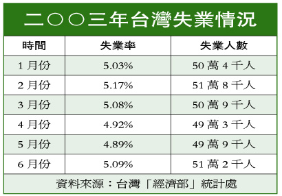 據(jù)臺灣媒體報道稱,6月份島內(nèi)的廣義失業(yè)率7.12%,也較5月增加0.03個百分點。據(jù)了解,6月就業(yè)人數(shù)為954.2萬人,失業(yè)人數(shù)51.2萬人,較5月增加13000人,主要是因為社會新鮮人出來找工作而失業(yè)居多。據(jù)相關官員稱,受到非典影響,6月畢業(yè)生還有很多尚未開始找工作,企業(yè)主也未真正開始征人,因此必須再看7月統(tǒng)計數(shù)字。