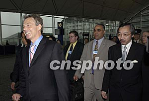 因受伊布都臺風影響,英國首相布萊爾七月二十三日提前結(jié)束在香港的訪問,乘專機離港。中新社圖
