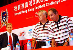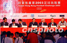香港投資推廣署2003足球挑戰(zhàn)賽將在7月27日在大球場舉行,香港足球總會會長霍震霆、投資推廣署署長盧維思、利物浦領(lǐng)隊侯利亞等7月25日在君悅酒店出席記者會。作者:洪少葵