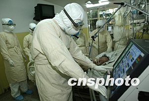 北京一名病程達(dá)89天、年近六旬的男性SARS患者,7月26日中午經(jīng)北京市首席SARS醫(yī)療專家王辰(前)等搶救無(wú)效死亡。目前,北京尚有12名住院SARS患者,經(jīng)專家組近日會(huì)診,絕大多數(shù)患者的SARS病癥已經(jīng)痊愈,沒有傳染性,困擾他們的是其他基礎(chǔ)病。中新社記者:任晨鳴