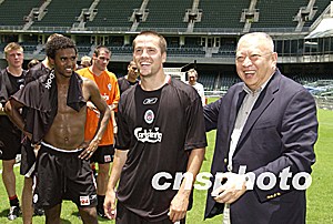 香港行政長官董建華,七月二十六日到香港大球場觀賞利物浦的賽前熱身訓(xùn)練。圖為董建華與球員談笑甚歡。中新社圖