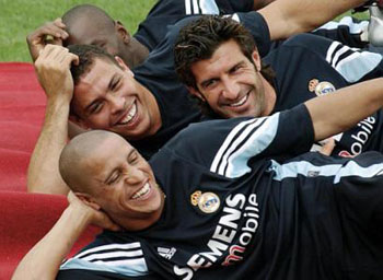 夏日的昆明,訓(xùn)練間隙,皇家馬德里隊(duì)的三大巨星羅納爾多、齊達(dá)內(nèi)和卡洛斯愜意的躺在訓(xùn)練場(chǎng)上,享受著“春城假日”。