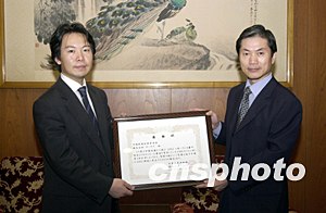 由中國新聞社日本分社與日本新秦公司聯合發(fā)起的防治“非典”網上募捐活動日前結束,南起沖繩,北至北海道,日本民眾、團體及在日華僑華人踴躍捐資,五十七萬日元捐款8月1日送交中國駐日大使館,請其轉交中國有關部門。圖為中國駐日使館李文亮參贊向新秦社長端木正和授予感謝狀,并請他轉達對各位捐款者的衷心感謝。中新社記者:陶光雄