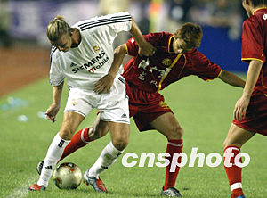 西班牙皇家馬德里足球隊(duì)與中國(guó)健力寶龍隊(duì)的比賽八月二日晚在北京工人體育場(chǎng)舉行。圖為龍隊(duì)隊(duì)員對(duì)貝克漢姆嚴(yán)加防守。中新社記者:毛建軍