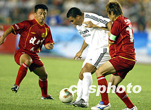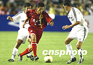 西班牙皇家馬德里足球隊(duì)與中國(guó)健力寶龍隊(duì)的比賽八月二日晚在北京工人體育場(chǎng)舉行。圖為羅納爾多被中國(guó)龍隊(duì)隊(duì)員前后夾擊防守。中新社記者:毛建軍