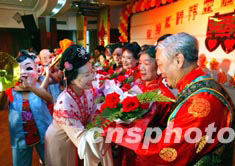 8月4日是中國(guó)的農(nóng)歷七月初七,民間稱之為"情人節(jié)"。相傳,牛郎與織女在這天鵲橋相聚,相互傾訴一年的思慕之情。福州鼓樓區(qū)歸國(guó)華僑聯(lián)合會(huì)特舉辦金婚、銀婚伉儷老人相約七月七活動(dòng),三百多位僑胞相聚在一起。圖為"七仙女"為八對(duì)金婚、銀婚伉儷老人獻(xiàn)花。作者:祝敏松