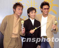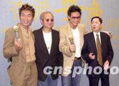 歌星許志安、蘇永康8月4日出席其《香港安康演唱會》記者會,兩人獲經(jīng)理人黃柏高(左二)及演唱會主辦機構(gòu)老板張耀榮(右一)送上鉆石咪高峰造勢助慶。中新社記者:鄧慶樂