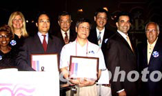 華裔小商業(yè)八月五日成為紐約納斯達(dá)克交易所的明星,四名華裔商家在這里受到美國(guó)聯(lián)邦中小企業(yè)管理局的表彰。圖為美國(guó)聯(lián)邦中小企業(yè)管理局局長(zhǎng)赫克托·巴雷特(右二)向獲獎(jiǎng)?wù)哳C獎(jiǎng)。作者:趙海燕