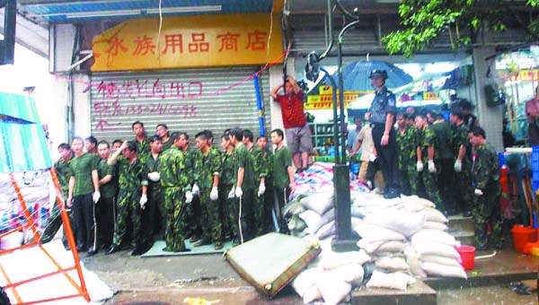據(jù)武副場(chǎng)長(zhǎng)介紹,8月5日下午3時(shí)15分左右,黃沙市場(chǎng)有關(guān)人員得知此事后,派出保安將紅線界上的店鋪移走。昨天上午8時(shí)左右,市水產(chǎn)供銷公司一方60多名身穿迷彩服的男子手持木棍、鋼管等物來(lái)到黃沙市場(chǎng)內(nèi)。市場(chǎng)內(nèi)的保安得知后就迅速向上級(jí)報(bào)告,并及時(shí)向荔灣區(qū)多寶路派出所報(bào)警。當(dāng)派出所警察趕至現(xiàn)場(chǎng)時(shí),勸說(shuō)對(duì)方放下木棒及鋼管時(shí),遭到對(duì)方拒絕。警察又迅速向110求援,隨后就有10多名防暴警察趕至現(xiàn)場(chǎng),用盾牌將雙方人員隔開。