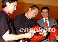 中國(guó)著名電影導(dǎo)演張藝謀導(dǎo)演的中央芭蕾舞團(tuán)新版《大紅燈籠高高掛》,八月八日在北京首演成功后,忙于為京城各界人士簽名。中新社記者:賈國(guó)榮