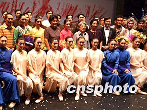 中國(guó)副總理吳儀八月十日晚觀看中央芭蕾舞團(tuán)新版《大紅燈籠高高掛》,與導(dǎo)演張藝謀和創(chuàng)作演出人員合影祝賀首演成功。中新社記者:賈國(guó)榮