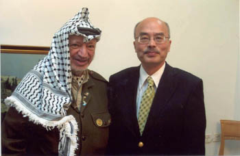阮:我們?nèi)ツ?月21號我曾經(jīng)到耶路撒冷,當(dāng)初跟他約了9月22號下午,我記得很清楚是四點(diǎn)半,我們?nèi)ブ凹s好的。我們飛機(jī)一降落耶路撒冷機(jī)場就聽到新聞,他的官邸已經(jīng)被以軍包圍,不但包圍還轟擊,所以我們等了好幾天,又試圖闖關(guān),不知道他住的地方,巴勒斯坦拉馬拉市到底是什么一種狀況。我們只能從電視看,所以我們曾經(jīng)試圖四處闖關(guān)都沒有成功,我們就倉然而回了。到了今年5月,我們再度跟他接觸,他也同意,因?yàn)樗麑ξ覀凐P凰一直是十分友好的。他也同意讓我們再去,結(jié)果我們要動身的時候發(fā)現(xiàn)以色列…,因?yàn)榈桨屠账固箾]有別的路走,只有陸路,約旦,安曼那個地方,陸路要走五六個小時。另外一個是從空中進(jìn)去,但要經(jīng)過以色列的同意,因?yàn)橐?jīng)過特拉維夫的機(jī)場,可是特拉維夫機(jī)場對香港去的,SARS疫區(qū)的人要檢疫兩到三天。換句話說要住進(jìn)醫(yī)院里去,我們那個時候也不能到醫(yī)院去住嘛,所以那次又推延了。