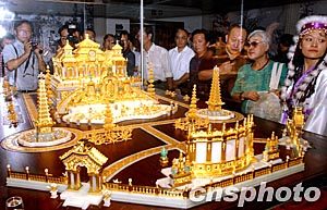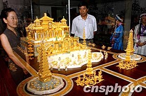 八月十二日,價(jià)值2.33億元人民幣的“金玉圓明園大水法”落戶圓明園,開(kāi)始為期一年的展示活動(dòng)。這一足金全寶石微縮工藝景觀以圓明園為大背景,由大水法、觀水法、遠(yuǎn)瀛樓三組建筑組成,經(jīng)數(shù)十位工藝美術(shù)大師用五年時(shí)間精心設(shè)計(jì)、創(chuàng)制完成,實(shí)用瑞士千足黃金60公斤、新疆和田玉100余公斤、鉆石2333粒、藍(lán)寶石649粒、紅寶石142粒、祖母綠29粒、翡翠205件、海水珍珠582粒、木座選用緬甸百年花梨木1.5噸制成,以再現(xiàn)當(dāng)年西洋樓大水法的輝煌與不凡。中新社記者:武仲林