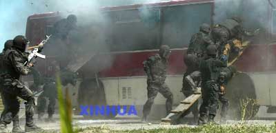 中國特戰(zhàn)隊(duì)員在依托步戰(zhàn)車進(jìn)行反恐演練。在擔(dān)負(fù)“城鎮(zhèn)清剿,解救人質(zhì)”的參演部隊(duì)中,還有一支由100多名指揮官和士兵組成的反恐分隊(duì)。這支分隊(duì)從組建至今,曾多次為外軍領(lǐng)導(dǎo)做過摩托車特技、飛車抓捕、攀登、戰(zhàn)術(shù)課目等軍事表演,受到了外軍領(lǐng)導(dǎo)人的高度評(píng)價(jià)。據(jù)介紹,在正式演習(xí)之前,這支反恐特戰(zhàn)分隊(duì)的隊(duì)員們每天都定下一個(gè)目標(biāo),利用臨睡之前的半個(gè)小時(shí)進(jìn)行演練。隊(duì)長(zhǎng)薛峰每天都與戰(zhàn)士們汗流浹背地在野外山地苦練,一個(gè)動(dòng)作,一招一式,絲毫也不馬虎。這支部隊(duì)的負(fù)責(zé)人曹鴻建說,反恐作戰(zhàn)不能沿用傳統(tǒng)的思維方式和戰(zhàn)法,為了應(yīng)付不同環(huán)境、不同條件下的突發(fā)事件,他們長(zhǎng)年進(jìn)行高強(qiáng)度、高難度的全面錘煉,目前,官兵們已全部進(jìn)入臨演狀態(tài),有信心完成這次多國聯(lián)合演習(xí)中的任務(wù)。