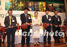 為推動(dòng)香港發(fā)展成國際化中醫(yī)藥研究及貿(mào)易中心,貿(mào)發(fā)局首次辦“國際現(xiàn)代化中醫(yī)藥及健康產(chǎn)品展覽暨會(huì)議”。圖為貿(mào)發(fā)局署理行政總裁黎黃靄玲(中)于十四日為開幕式剪彩。作者:裘之越