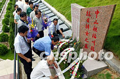 抗日戰(zhàn)爭勝利五十八周年之日,中山艦福州籍抗日將士之墓在福州三山陵園落成,八十八歲的中山艦幸存老兵邱奕殿與部分抗日將士家屬特地來到墓前,為遇難者獻(xiàn)上鮮花。1938年10月24日,在武漢保衛(wèi)戰(zhàn)中,中山艦遭六架日軍飛機(jī)轟炸,不幸沉沒,艦長薩師俊等二十五名官兵血祭長江,其中有二十二位是福州籍官兵。作者:祝敏松