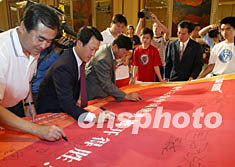 十五日,中國體育代表團出征世界大學(xué)生運動會贊助儀式在北京舉行,美國耐克公司成為中國大運代表團歷史上第一個國際贊助商。圖為在捐贈儀式上,各方代表在中國大運健兒的“心愿旗”上簽下祝福。中新社記者:趙振清