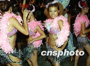 “好客日”和“香江明珠激光匯演”八月十七日在香港維多利亞港畔舉行,圖為香港歡歌艷舞迎“好客日”。中新社記者:錢興強