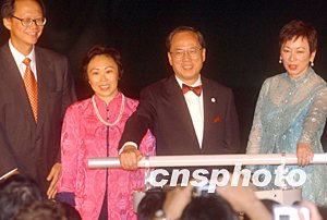 香港政務(wù)司司長曾蔭權(quán)和香港旅游發(fā)展局主席周梁淑怡等,八月十七日為“香江明珠激光匯演”主持啟動儀式。中新社記者:錢興強