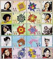 該郵政公司推出的個(gè)人化郵票結(jié)合鄧麗君照片以10種不同形式的中國(guó)結(jié),分別代表:萬(wàn)壽長(zhǎng)春、四季如意、招財(cái)進(jìn)寶、吉祥納福、花開(kāi)富貴、締結(jié)良緣、步步高升、吉慶有余、金玉滿堂、福增貴子等吉祥口采。