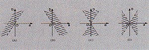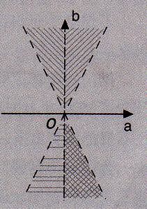 在圖A、B和D中,凡邊界均以虛線示之,凡不連通的區(qū)域均以不同斜率的陰影線區(qū)別之。然而,在標(biāo)準(zhǔn)答案圖C中的b軸用實(shí)線表示,并且b軸兩側(cè)與b軸相鄰的角形區(qū)域用同一斜率的連貫陰影線表示為單一的連通區(qū)域,所以b軸明確地不是邊界。這樣就使“不包括邊界”這個(gè)附注不能對(duì)b軸發(fā)生作用。圖C中只有兩根邊界(虛線表示),所以圖像M表示了不等式F(|b|>|2a|),而不表示不等式E(|b|>|2a|,且a≠0)。所以標(biāo)準(zhǔn)答案圖C是錯(cuò)誤的。四個(gè)選項(xiàng)中沒有一個(gè)正確,這與提示中所說“在每小題給出的四個(gè)選項(xiàng)中,只有一項(xiàng)是符合題目要求的”相矛盾,從而該題是錯(cuò)題!而正確答案應(yīng)為圖二。