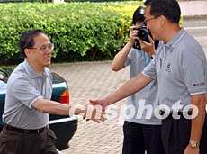 香港警務(wù)處長曾蔭培,八月二十一日在香港少年警訊滅罪夏令營活動上,迎候政務(wù)司司長曾蔭權(quán)。中新社記者:錢興強(qiáng)