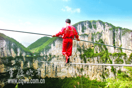 這次走鋼絲離地面絕對(duì)高度達(dá)到了六百多米,打破了由美籍加拿大人杰伊-科克倫和他本人在一九九七年于三峽夔門創(chuàng)造的高空行走高度的世界紀(jì)錄,前兩次鋼絲距地面高度僅為三百米。
