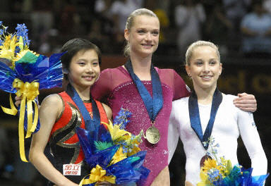 今晚的女子個(gè)人全能金牌爭(zhēng)奪主要在霍爾金娜和美國(guó)選手帕特森之間進(jìn)行,霍爾金娜勝在她的兩個(gè)強(qiáng)項(xiàng)高低杠和自由體操,特別是自由體操,身材修長(zhǎng)的霍爾金娜以杰出的藝術(shù)表現(xiàn)力感染觀眾、征服裁判,得到九點(diǎn)六七五的高分,在最后時(shí)刻以三十八點(diǎn)一二四分反超在觀眾狂呼中同樣表現(xiàn)出色的東道主選手帕特森。帕特森以零點(diǎn)一八八分之差獲得銀牌。