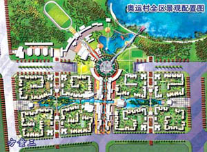 。牐犨@個(gè)設(shè)計(jì)方案把傳統(tǒng)的中國(guó)住宅規(guī)劃模式轉(zhuǎn)化為由奧運(yùn)五環(huán)幻化而成的曲線,圓形升旗廣場(chǎng)象征“龍珠”。