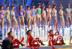 據(jù)美國《世界日報(bào)》報(bào)道,始于1973年的港姐選舉,今年是第31屆。本屆決賽主題是“秋水伊人――脫俗出塵”,主辦單位香港電視廣播有限公司(無線)特意斥巨資在場內(nèi)搭建大型游泳池突顯主題。佳麗們時(shí)而在泳池中“芙蓉出水”,時(shí)而在封蓋的泳池上歌舞。背景臺(tái)上描繪的是典雅的中國山水畫,映襯出佳麗們脫俗的氣質(zhì)。